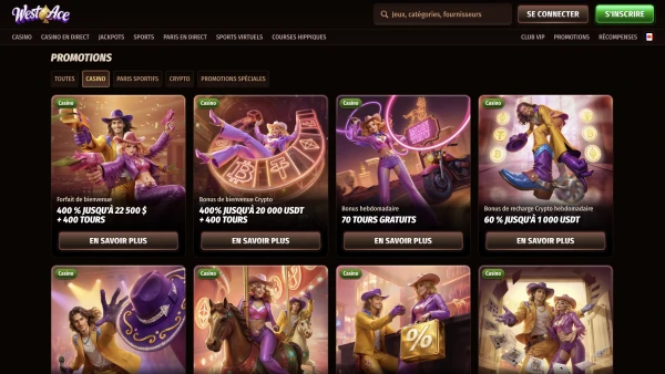 Si vous recherchez spécifiquement un bonus sans dépôt du casino Westace, veuillez noter que nos offres actuelles au Canada sont basées sur dépôt. Il est donc important de vérifier les conditions avant de réclamer, surtout si vous visez des tours, du cashback ou l’accès aux reloads crypto.