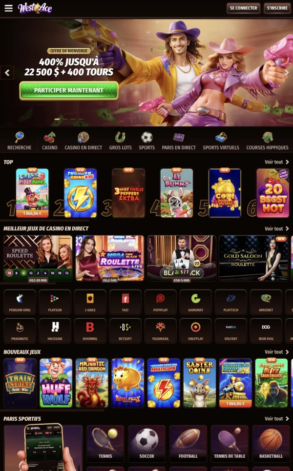 - Offres de bienvenue et promotions régulières, incluant le pack bonus Westace, des recharges du week-end, des free spins hebdomadaires et des options de recharge crypto.